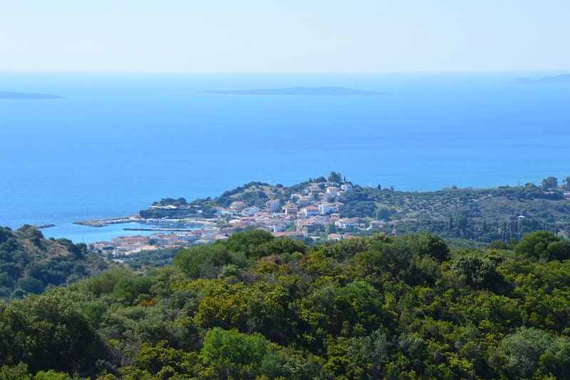 In de wonderschone en zeer vruchtbare vallei, die zich uitstrekt van de zee tot aan het veel hoger gelegen buurdorpje Zizani, staan overal olijfbomen afgewisseld met cipressen, sinaasappelbomen en druiven.